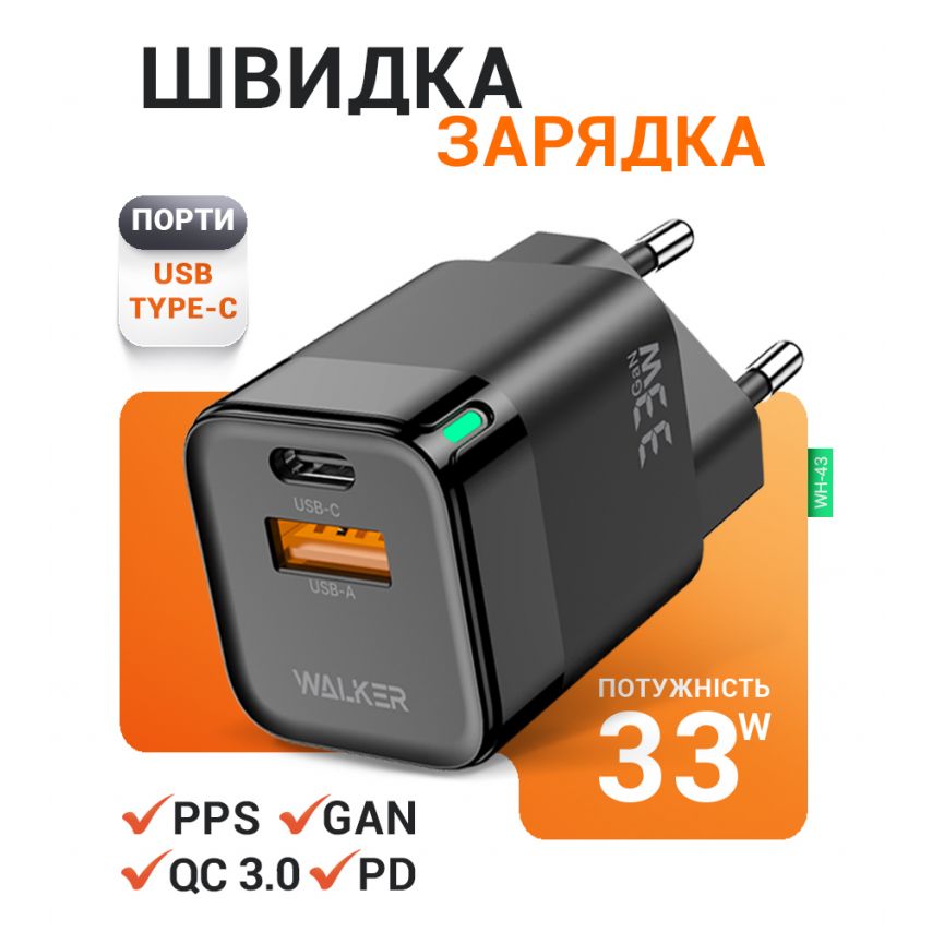 Мережевий зарядний пристрій (адаптер) WALKER WH-43 33W GAN PD_33W / QC3.0_18W black